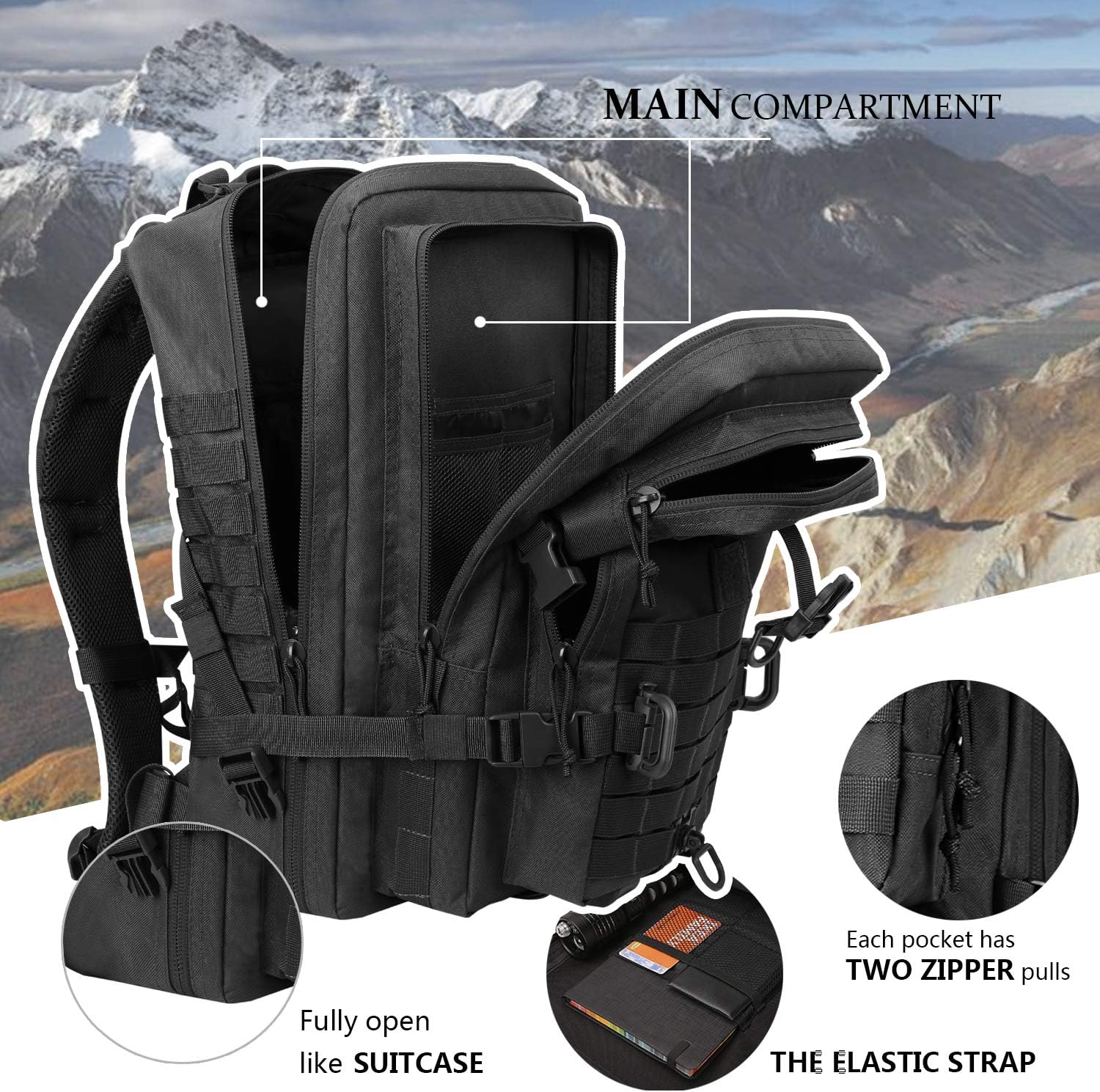 Constructed from high-quality, water-resistant material, this tactical backpack is built to withstand the toughest conditions. The MOLLE system allows you to customize and expand your pack with additional pouches and accessories, giving you the flexibility to carry all your essential gear with ease.